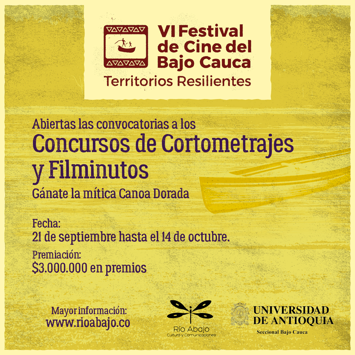 El VI Festival de Cine del Bajo Cauca, que tiene como temática “Territorios Resilientes”, busca incentivar la creación artística y cultural de los habitantes del Bajo Cauca, Norte de Antioquia y Sur de Córdoba, a través de la producción audiovisual, asimismo, pretende consolidar un espacio donde todas las realizaciones de productores aficionados o experimentados de la Región y su área de influencia puedan ser visibilizadas. Por tal motivo, desde el 21 de septiembre hasta el 14 de octubre, la sexta versión del Festival, tendrá abierta la convocatoria a los concursos de Cortometrajes y Filminutos “Territorios Resilientes», en la cual podrán participar los amantes del mundo audiovisual que cumplan con las condiciones del concurso.